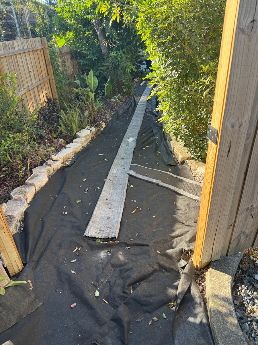 This customer had flooding water coming down her back yard. The solution was to install Hydraway Drainage system with Flexi Mulch over top.